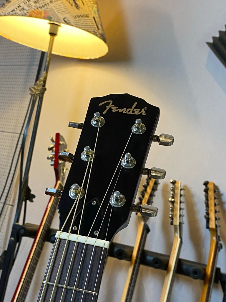 Em meados dos anos 20, o inventor e luthier John Dopyera, atendendo a um pedido do amigo músico (George Beauchamp), desenvolveu o violão ressonador para produzir um instrumento que tivesse o volume mais alto que os violões tradicionais e que esse volume pudesse competir com os instrumentos de sopro e percurssão das orquestras de dança da época. Dopyera experimentou configurações de até quatro cones ressonadores e cones compostos de vários metais diferentes. O violão Resonator (mais conhecido como Dobro) é um instrumento acústico que produz som conduzindo as vibrações das cordas através da ponte de madeira para um ou mais cones de metal no interior do corpo (ressonadores), ao invés de transferir para a caixa de ressonância do instrumento (corpo e tampo) como os violões tradicionais. Eles se tornaram apreciados pelo seu timbre distinto (metálico), e encontraram vida com a música bluegrass e o blues bem depois que a amplificação elétrica resolveu o problema do volume inadequado. Muitas variações de todos esses estilos e designs foram produzidas por várias marcas durante os anos. O corpo de um violão ressonador pode ser feito de madeira, metal, ou ocasionalmente de outros materiais. Esse exemplar fabricado pela Fender em 2012 é um verdadeiro achado, super difíceis de se encontrar no mercado, o modelo FR-55 tem acabamento superior aos outros modelos da marca, corpo de metal, além das incríveis e lindíssimas gravuras por todo o corpo, tornando-o um instrumento único e de visual maravilhoso. É conhecido como o violão da capa do disco do Dire Straits (Brothers In Arms), esse é incrível, em perfeito estado e 100% original, é só pegar e tocar, ou até mesmo ficar decorando sua sala!