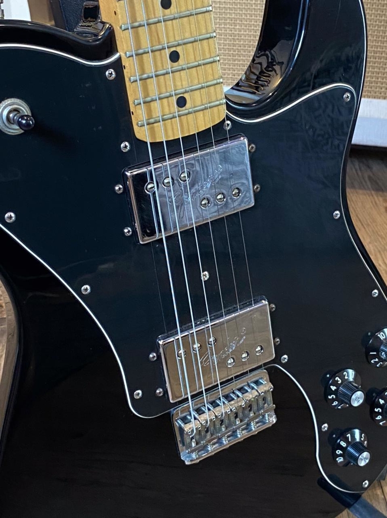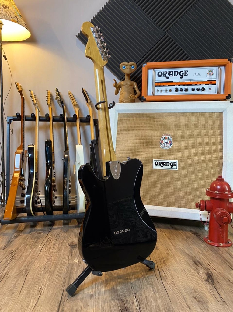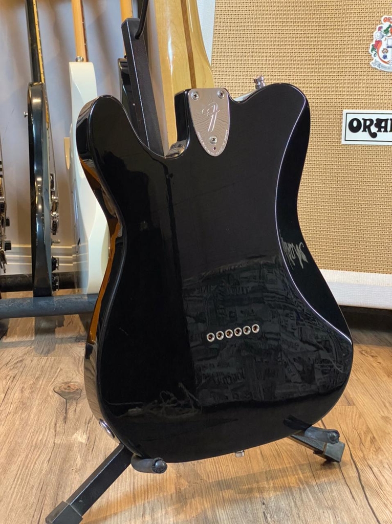 Fender Telecaster Deluxe ‘72, tem como base as vintage Deluxe dos anos 1970, equipadas com 2 humbuckers e o headstock grande, como as Stratocaster do mesmo período. Um instrumento lindíssimo, versátil e que atende desde os conservadores do som da Tele, quanto aos artistas que querem um instrumento estiloso para brilhar nos palcos, ensaios e gravações. Graças aos captadores humbucker, essa guitarra é muito silenciosa, não apresentando ruídos quando plugada (comum nas guitarras com captadores single coil), além de ser um instrumento confortável e de fácil adaptação. Uma verdadeira guitarra “coringa”, do rock ao blues, do country ao gospel, ela se apresenta lindamente sob todas as circunstâncias. Regulada, com cordas novas e pronta para ser desfrutada.