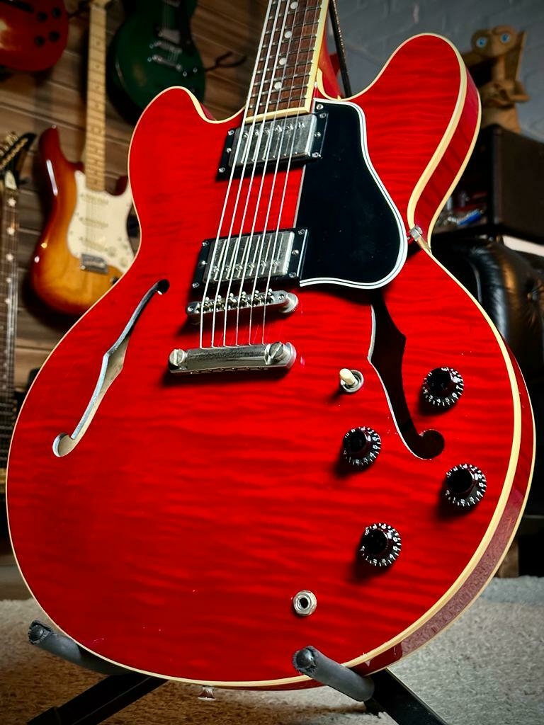 Uma das guitarras mais sensacionais de todos os tempos, A 335 Cherry é um verdadeiro clássico que nunca sai de moda, lançada oficialmente em 1958, a ES-335 foi a primeira guitarra semi-hollow body, a ser lançada em linha para venda ao público. O corpo com bloco sólido de maple, os dois cutways, os f-holes baseados no violino e os dois humbuckers ajudam a moldar a sonoridade única desse instrumento, que foi, na verdade, criado para ser um híbrido, entre as guitarras de corpo sólido e as acústicas. Esse exemplar fabricado em Nashville/TN em 19 de julho de 2000 feita exclusivamente para Yamano, é simplesmente perfeito, foi comprada no Japão pelo conhecido guitarrista Ricardo Marins, tem o tampo e fundo em Maple completamente figurado, na cor tradicional Cherry, marcação Dot em madrepérola, escala com raio 12’’, tocabilidade absurda e o timbre nem dá pra comentar, é simplesmente incrível. Inúmeros artistas utilizaram as ES, tais como Chuck Berry, Larry Carlton, Alvin Lee, Alex Lifeson, B.B. King, Noel Gallagher, Eric Clapton na época do Cream, entre tantos outros. Essa guitarra está perfeita, com poucas marcas de uso, toda original, teve um pequeno reparo no headstock que está perfeito, toda revisada e regulada, com tag e case original Gibson marrom, uma guitarra maravilhosamente linda e perfeita.