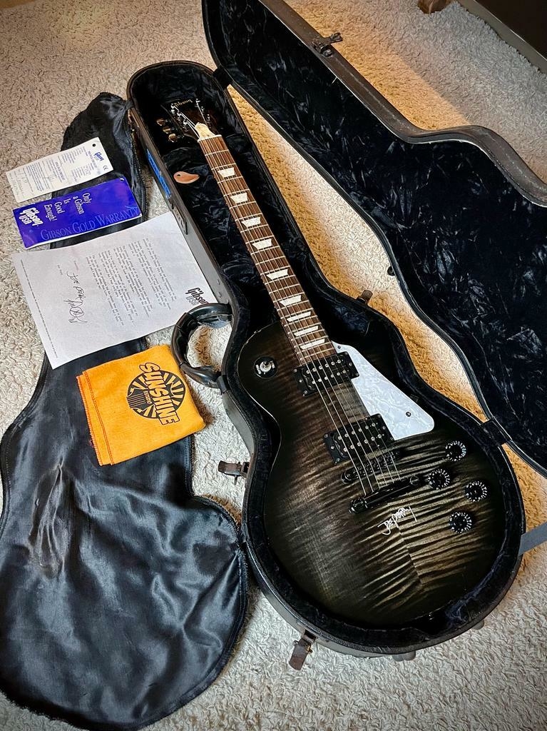 Joe Perry é um dos guitarristas mais famosos de todos os tempos, junto de sua banda Aerosmith, o músico coleciona Hits e Riffs marcantes na história do Hard Rock mundial. A parceria com a Gibson é de longa data, juntos já desenvolveram alguns modelos Signature dele. Esse é primeiro modelo Signature de Perry, lançada oficialmente em 1996 e foi até 1999, o modelo leva características únicas a pedido de Perry, sendo o corpo em mogno mais largo que o convencional, o tampo em Flamed Maple, o braço com perfil Fat tipo 57, hardware preto e acabamento na cor Blackburst, dando um visual sombrio e incrivelmente lindo pra essa guitarra, a parte elétrica conta com um captador 57 Classic no braço e um Joe Perry Signature na ponte, esse captador signature tem alto ganho e muito peso, na parte elétrica são 2 volumes, 1 master tone e 1 pot Push/Pull que dá acionamento ao sistema ativo de Midrange/Sustain trazendo timbres de Wah Wah, é bem exótica e diferente. É uma guitarra diferenciada, com um baita som, pegada clássica e acabamento lindo junto do kit de escudos em Madrepérola e a assinatura de Joe Perry no tampo logo abaixo do cordal. Perry utilizou esse modelo quase que em toda a gravação do disco Nine Lives do Aerosmith, são inúmeros videoclipes utilizando sua Signature. Esse exemplar fabricado em 1997 está em muito bom estado, sem reparos ou danos, totalmente revisada e regulada, acompanha tags, carta do Joe Perry e hard case original Gibson Joe Perry.