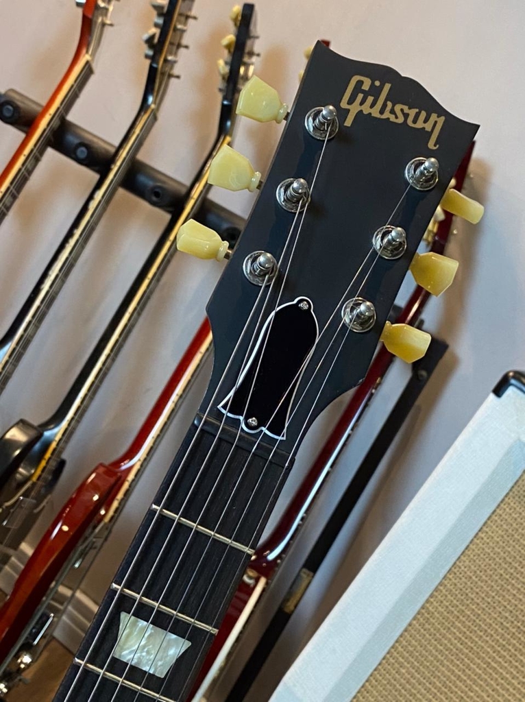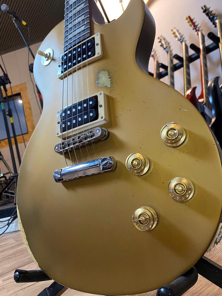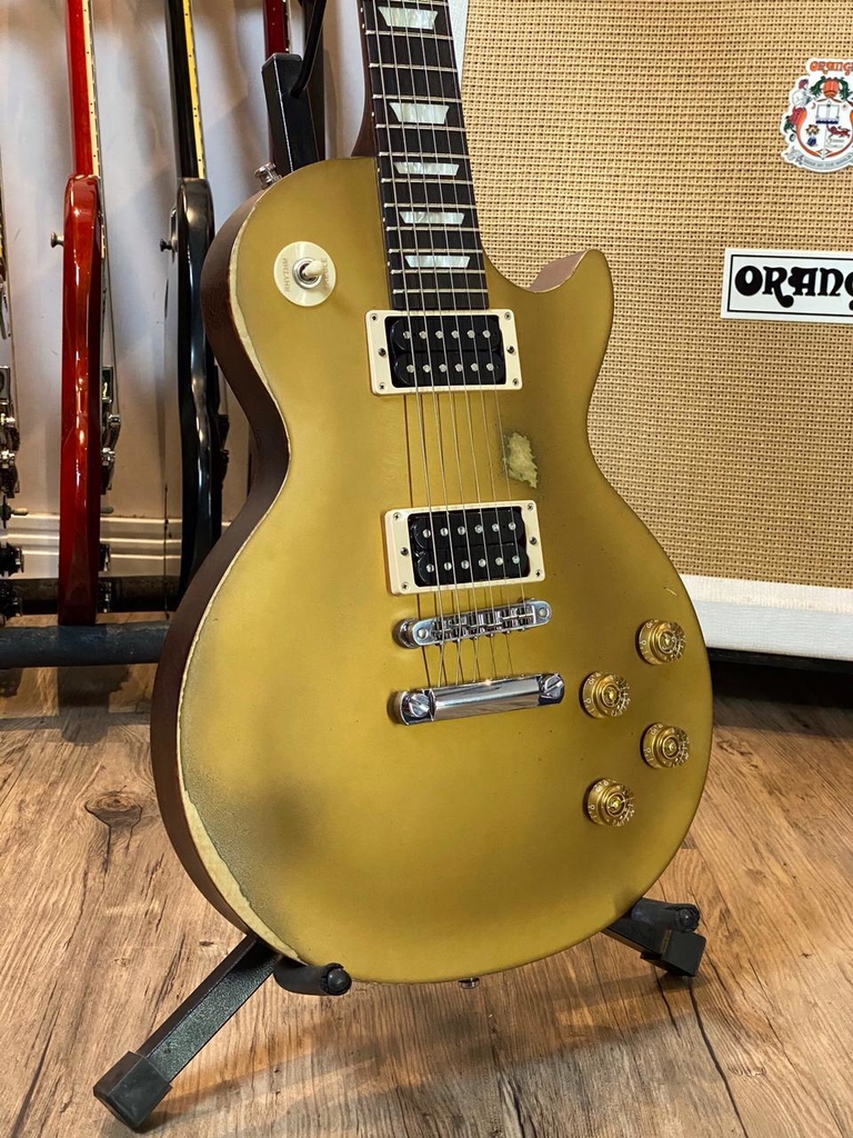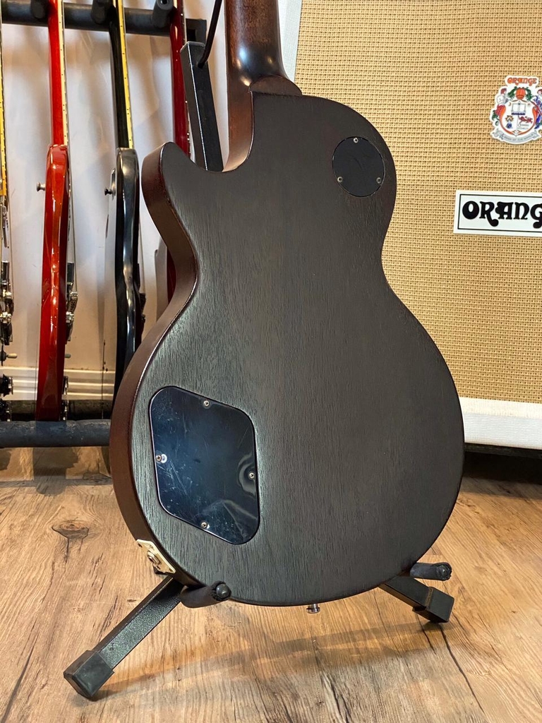 Essa é uma daquelas guitarras fantásticas e por um preço bem acessível, a Gibson Les Paul LPJ é uma guitarra da mesma família das Studio e Tribute, ela tem um visual mais fechado com pequenas diferenças no acabamento (sem verniz), capas plásticas pretas (covers) nos captadores e acabamentos das tarrachas na cor preta (Black Button). Esse exemplar recebeu um “Upgrade” no visual, foram removidos os covers plásticos dos captadores para dar o visual OpenCoil tradicional, as molduras pretas dos pickups foram substituídas por originais Gibson na cor creme, assim como a ponteira da chave seletora, moldura da chave e jack plate, todos na cor creme, os knobs pretos foram substituídos por originais Gibson modelo speed na cor Gold e as tarrachas foram substituídas por originais Kluson Deluxe com ponteira Vintage, esses upgrades de muito bom gosto deram um visual diferenciado e lindo pra essa guitarra, dentro das especificações ela tem o corpo em Mogno, top em Maple, braço em Hard Maple 50’s, escala em Rosewood, marcação Trapezoidal Madrepérola, ferragem Cromada, captação original Gibson 490R no braço e 498T na ponte, chave 3 posições, controles 2 Volume e 2 Tone, é uma guitarra sensacional com tocabilidade e sonoridade incríveis, trastes em excelente estado (médio Jumbo), a pintura em nitro sem verniz acaba acelerando o desgaste e envelhecimento, essa guitarra está com um visual Aged sensacional, lembrando bastante a Les Paul Gold Top clássica do Slash. Se vc procura uma guitarra Gibson USA top, com preço acessível e visual maravilhoso, essa é uma ótima opção, acompanha Gig Bag Gibson Original.