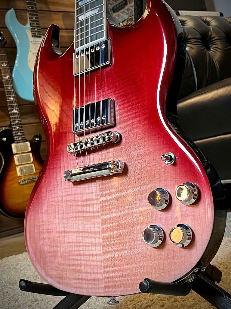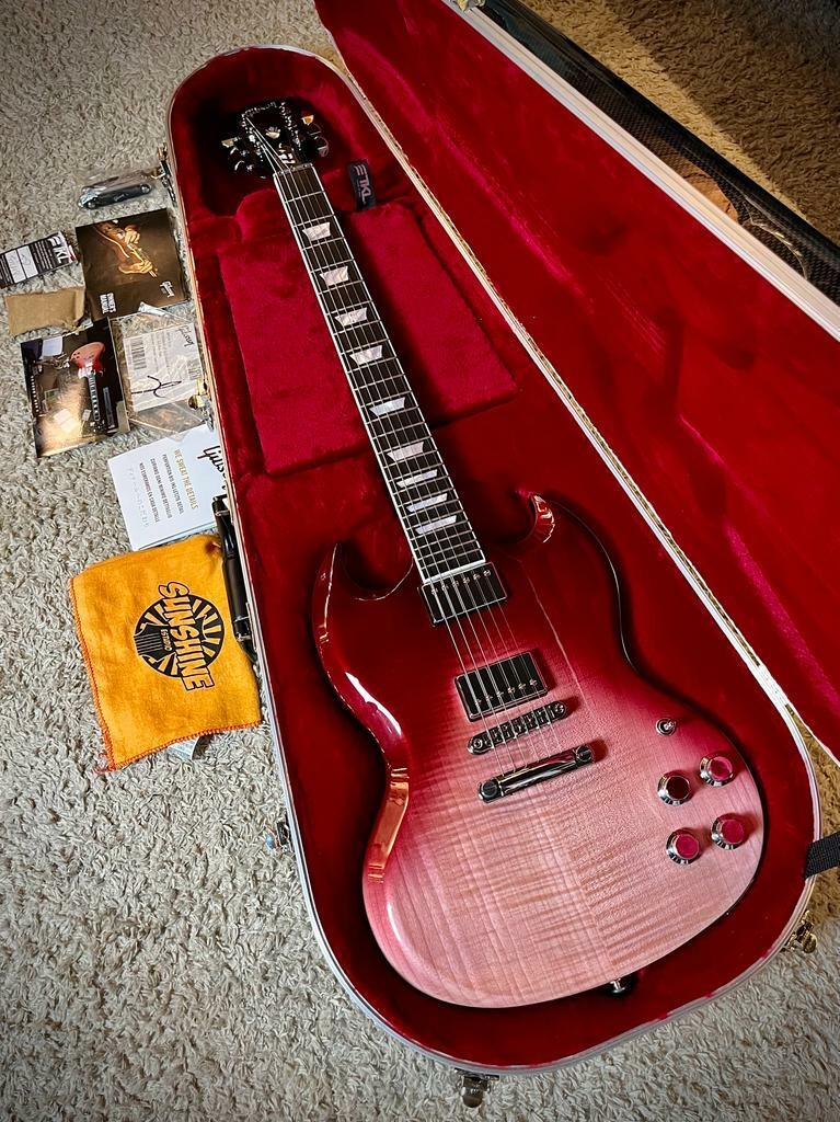 A SG Standard HP-II é uma guitarra clássica SG porém com um toque moderno e elegante, com o tampo de maple AA adicionado ao tradicional corpo e braço de mogno sólido. Apresentando materiais avançados, incluindo o Nut ajustável de titânio e os Saddles da ponte também em titânio para melhor desempenho, braço com 24 casas, trastes com acabamento sobre o binding, braço com shape slim taper e junção com o corpo tipo axcess, tornando o acesso as últimas casas muito mais confortável. Timbres gigantes dos dois captadores humbucking 57 Classic no braço e um Super 57 Classic na ponte, além do sistema DIP interno com opção de mais de 5 combinações diferentes para os 2 push-pull, você pode optar por defasar os Humbuckers para Singlecoil, tirar de fase, acionar o HighPass Filter ou Suppression, são várias opções pra vc escolher. Os knobs cromadas dão um charme e visual moderno nessa SG, o corpo é ligeiramente mais espesso dando um pouco mais de peso na sonoridade e equilíbrio geral. É uma SG espetacular quando plugada, a sonoridade dela é incrível e difícil de descrever, é encorpada e bem definida, o acabamento Hot Pink Fade levemente metálico e ao mesmo tempo translúcido dá um visual moderno e elegante além do tampo em flamed Maple lindíssimo, é uma guitarra de tirar o fôlego em todos os aspectos, embora fabricada em 2018 é um instrumento novo, sem detalhes, com todas as tags, chaves, case original com acabamento em fibra de carbono. Totalmente regulada e pronta pra arrasar. Essa é ‘’A’’ SG!!!