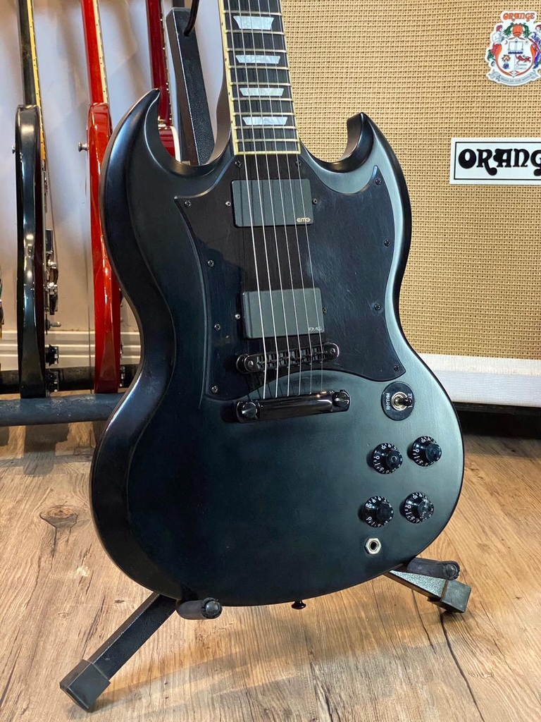 A Gibson SG é sem sombra de dúvida uma das guitarras mais emblemáticas de todos os tempos, com inúmeras séries desde 1961, a Gibson sempre mostra as caras lançando edições especiais além das tradicionais, fazendo com que esse modelo agrade à todos os públicos e perfis. Essa guitarra faz parte da série “Guitar Of The Week” lançada pela Gibson em 2007, com edições especiais e limitando a produção de somente 400 guitarras de cada, sendo uma edição por semana, no caso dessa SG é a “Guitar Of The Week #32”. É uma SG com visual semelhante as SG Gothic porém com características da SG Standard, tem o corpo em Mogno, braço em Mogno perfil 60, escala em Ébano (madeira utilizada na escala das Les Paul Custom), friso lateral no braço (Binding) e marcação Madrepérola Trapezoidal (SG Standard), o acabamento é diferente do Satin Black das SG Gothic, essa tem o acabamento Matte Black (Nitro) que é mais denso e com pouca porosidade em comparação ao acabamento Satin, tem o escudo Black 1 Ply, captação EMG 81/85 original dessa série, chave 3 posições, controles 2 Volume e 2 Tone, ferragem Black, tarraxas Grover Black, tampa do tensor SG (Truss Rod Cover), detalhe para a tampa traseira da elétrica que diferente das tradicionais, já tem o compartimento da bateria 9v para os EMG. É uma guitarra fantástica, com visual mais Dark, captação ativa pra todos os tipos de som, principalmente os mais pesados como já são conhecidos os EMG, uma guitarra animal e diferenciada, em excelente estado, ano 2007, acompanha Tags e Case Original Gibson.