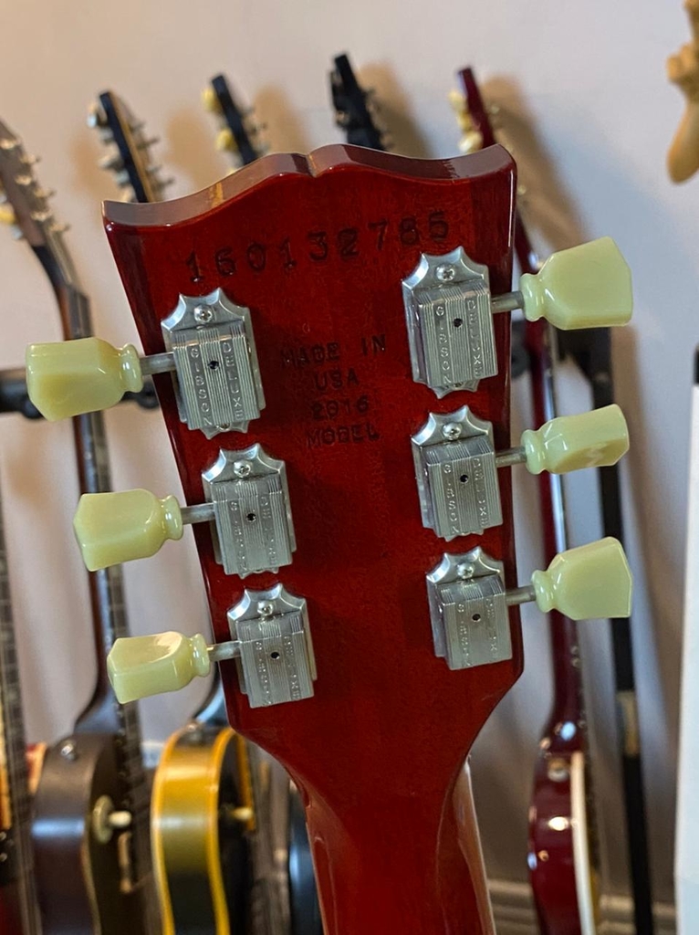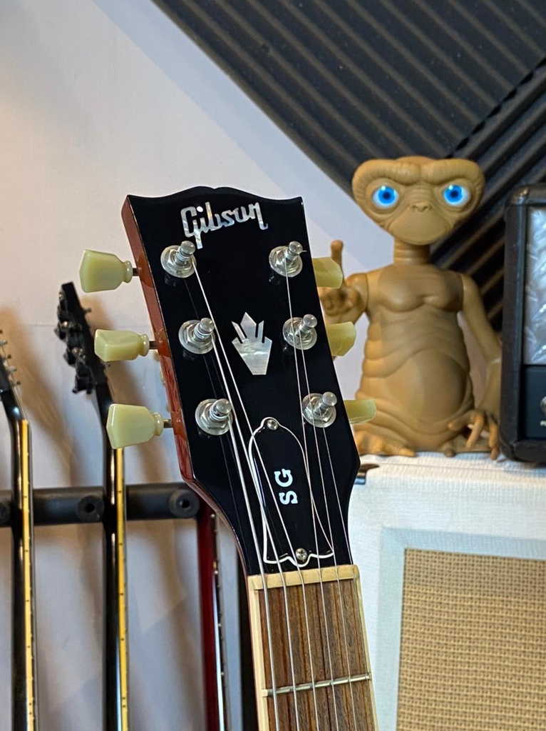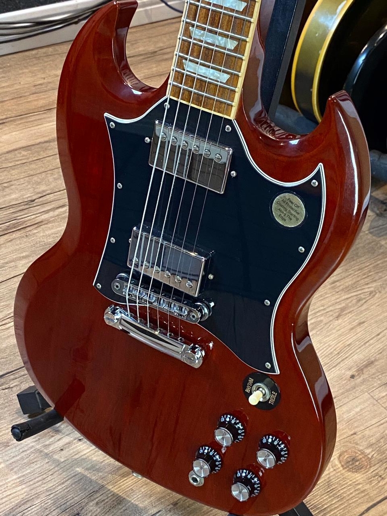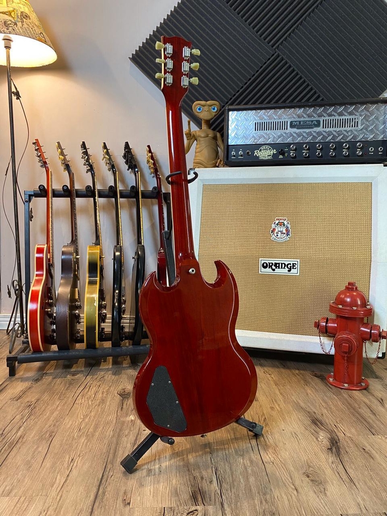 Uma das guitarras Gibson mais vendidas de todos os tempos, a SG Standard Cherry é um clássico, modelo lançado oficialmente em 1961, a SG até hoje acumula seus amantes e admiradores. Esse exemplar fabricado em 2016 foi adquirida “zero” em 2017 e ficou 4 anos guardada dentro do case sem sair de casa, nova, intacta e ainda com os plásticos e selo no escudo. Ela tem o corpo e braço em Mogno, escala em Rosewood, marcação Trapezoidal Madrepérola, ferragem Cromada, tarrachas Gibson Deluxe, escudo 5 Ply, captação Gibson 490R no braço e 498T na ponte, chave 3 posições, controles são 2 Volume e 2 Tone, guitarra que dispensa comentários, tocabilidade absurda e sonoridade impecável, um baita timbre, a cor Cherry traz todo o visual lindo e tradicional das SG, a guitarra é absolutamente nova, maravilhosa, sem marcas ou qualquer tipo de desgaste, é só plugar e tocar, acompanha Tags, Manual, Certificado, Chaves, Foto de inspeção da Fábrica e Hard Case original Gibson.