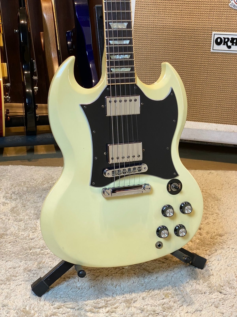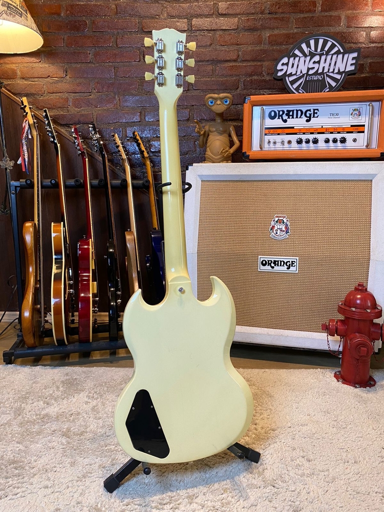 Guitarra sensacional, clássica e limitada! A SG Standard já é conhecida como uma das guitarras Gibson mais vendidas de todos os tempos. Modelo lançado oficialmente em 1961, ela até hoje acumula seus amantes e admiradores. Esse exemplar é uma série limitada na cor (CREAM), tem uma coloração um pouco mais amarelada que as cores Polaris White e Classic White, trazendo todo o charme das SG clássicas porém com uma cor diferenciada, é uma Limited Edition com escala em Baked Maple, entregando um timbre mais brilhante com harmônicos mais evidentes, foi fabricada apenas entre os anos de 2011 e 2012. Essa foi fabricada em Nashville em 07 de outubro de 2011, é uma guitarra espetacular e que dispensa comentários, pintura em nitrocelulose, está em ótimas condições, 100% original, foi vendida ‘NOVA’ aqui na loja em 2012 e teve apenas 1 dono, tem poucas marcas de uso, está totalmente revisada e regulada, tocabilidade incrível e sonoridade absurda, o timbre dessa guitarra é impressionante, guitarra pronta, é só plugar e tocar, acompanha tags, manual e hard case original Gibson.