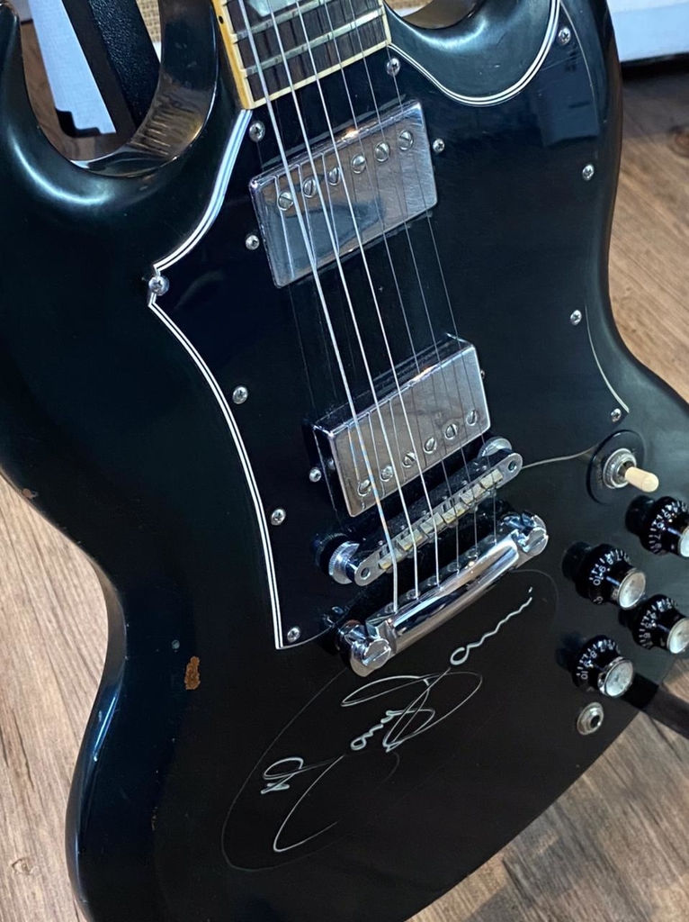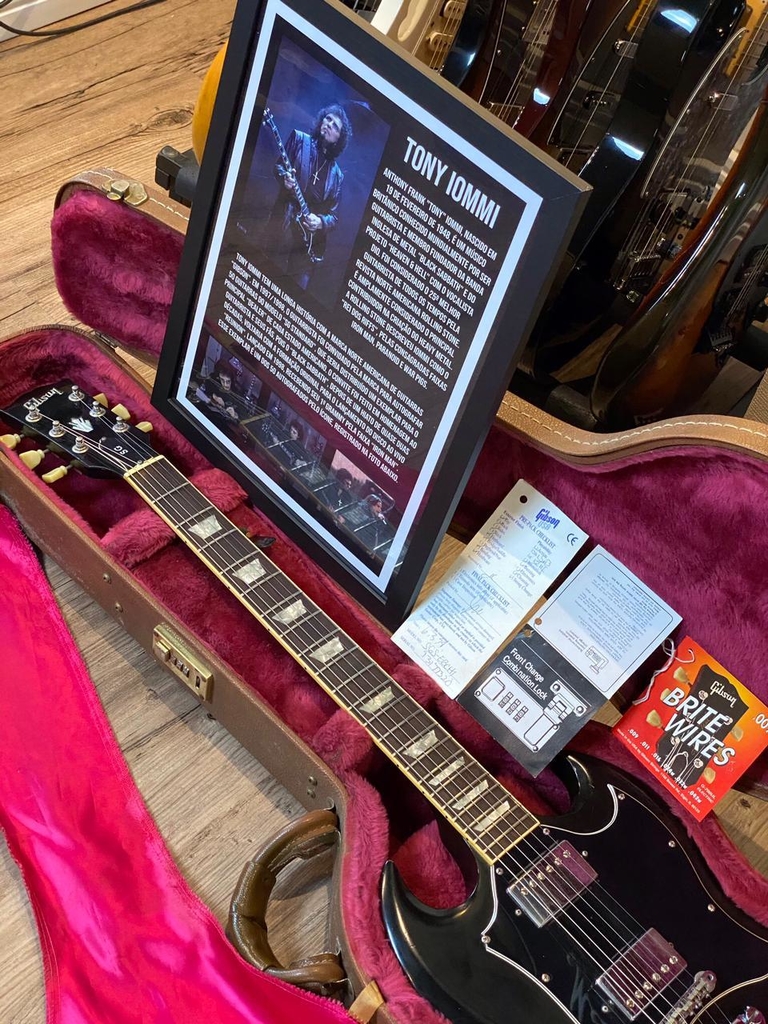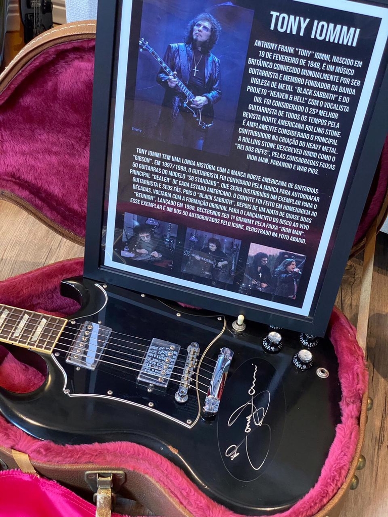 Essa SG tem bastante história, em 1997 Tony Iommi foi convidado pela Gibson para o lançamento oficial dos seus captadores Gibson Signature e também de 50 guitarras Gibson SG Standard autografadas pelo Artista, que seriam distribuídas para o principal Dealer Gibson de cada estado americano, totalizando 50 guitarras. O convite da Gibson foi feito em homenagem ao guitarrista e seus fãs, pois o Black Sabbath, depois de um hiato de quase duas décadas, voltaria com a formação original para o lançamento do disco ao vivo entitulado “Reunion”, lançado em 1998. Esse exemplar é um dos 50 autografados pelo ícone na fábrica da Gibson, com fotos e vídeos da própria Gibson registrando esse momento. Essa guitarra tem o corpo e braço em Mogno, escala em Rosewood, marcação madrepérola Trapezoidal, ferragem Cromada, tarrachas Gibson Deluxe, captação 490R no braço e 498T na ponte, chave 3 posições, controles 2 Volume e 2 Tone, a guitarra está 100% original, pintura com algumas marcas de uso e apresenta envelhecimento natural, levemente “Aged”, a assinatura foi coberta com a película protetora original para evitar o desgaste da mesma. É um instrumento colecionável, diferenciado e com o aval de um dos pais do Heavy Metal, acompanha tags, quadro e hard case Gibson Brown original.