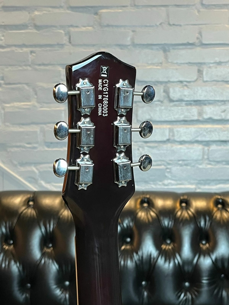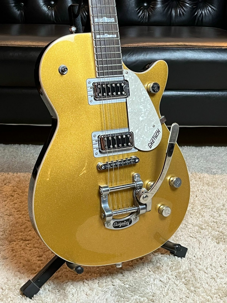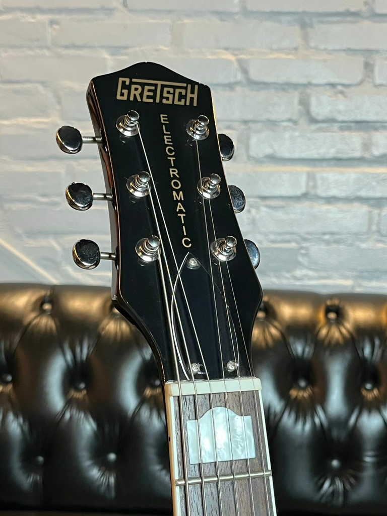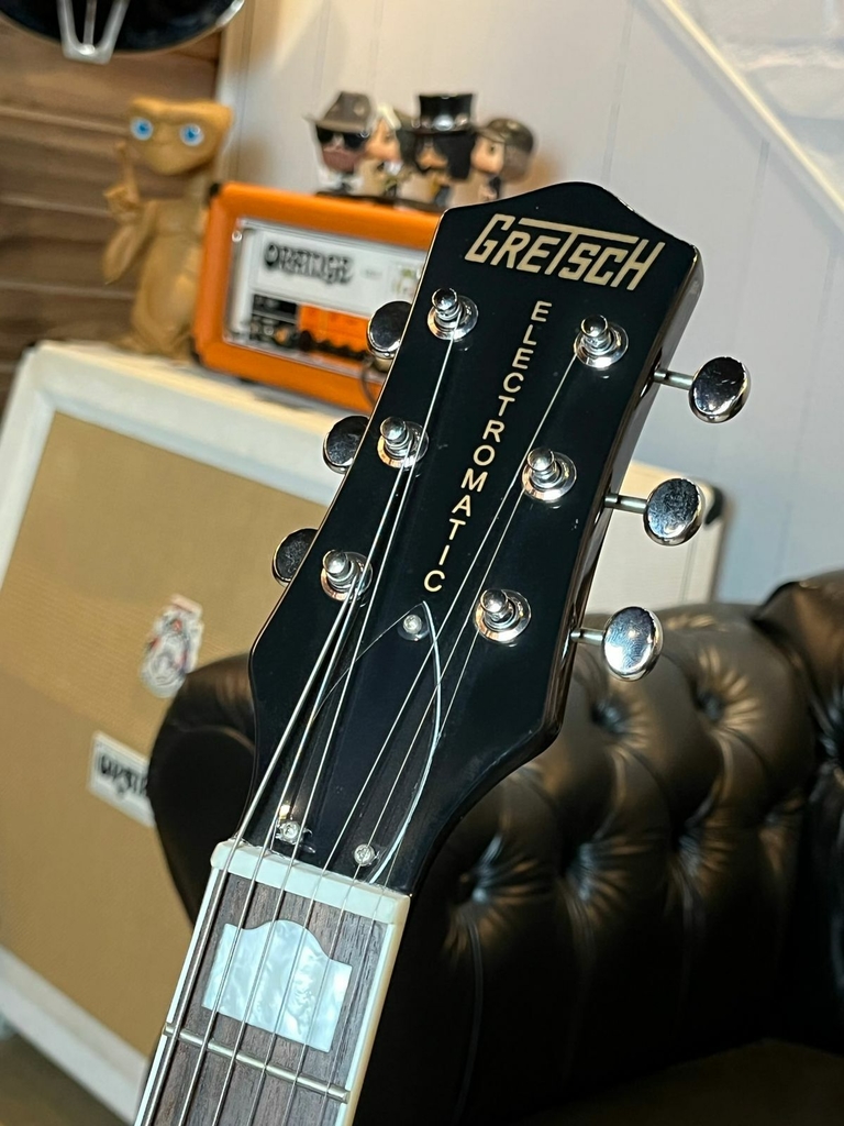 As guitarras Gretsch são símbolo de requinte, sonoridade e visual incríveis, a guitarra Electromatic G5438T Pro Jet Bigsby é uma opção acessível pra quem quer uma autêntica Gretsch, com uma construção e acabamentos lindíssimos juntos de uma sonoridade animal, a captação FilterTron traz um timbre encorpado e com harmônicos abundantes, seu corpo em Basswood-chambered com o tampo em maple a deixa mais leve e com uma ótima ressonância, resultando no som clássico das Gretsch. Esse exemplar fabricado em 2017 está em perfeito estado, muito nova, toda original, sem marcas ou batidas, ainda com os plásticos nos escudos, escudo em madrepérola, tocabilidade bem macia, toda revisada e regulada, uma ótima opção pra quem procura uma guitarra com muito som e visual por um valor mais acessível, além claro da ponte vibrato Bigsby B50, que dá um toque final lindíssimo nesse instrumento. Pronta pra plugar e tocar!