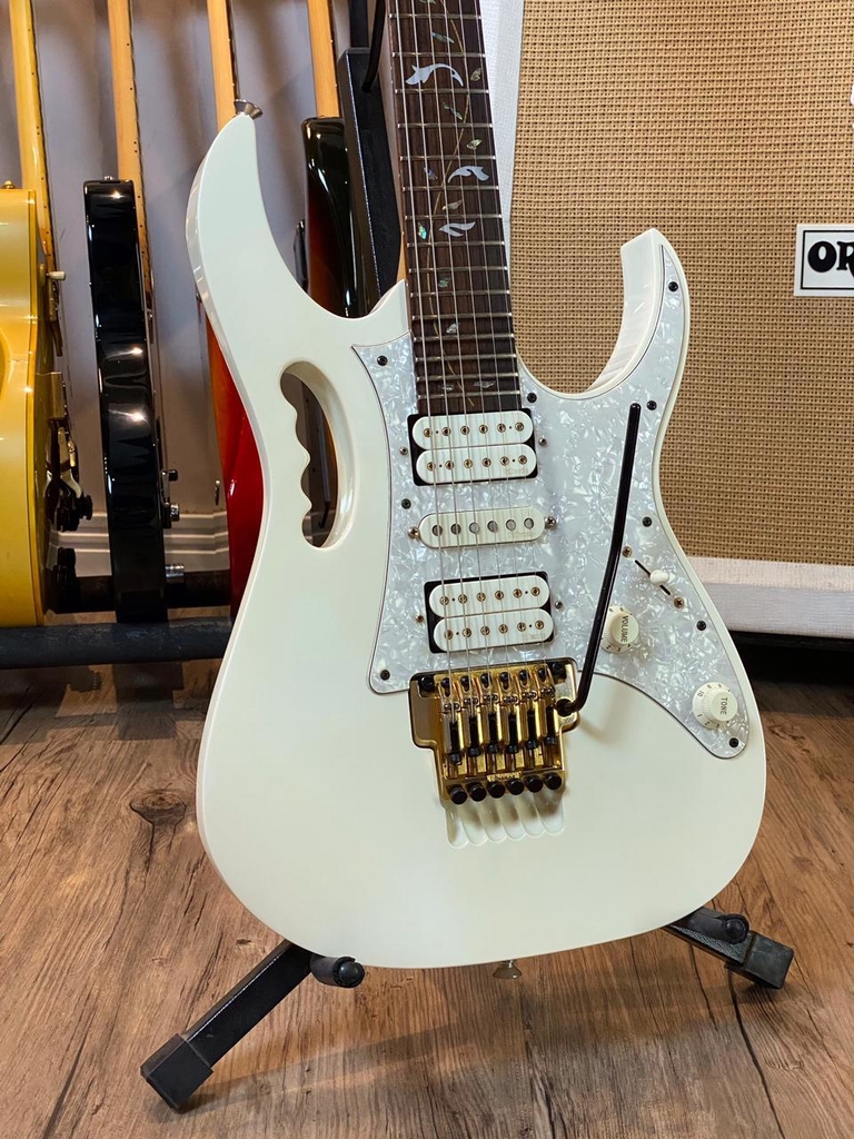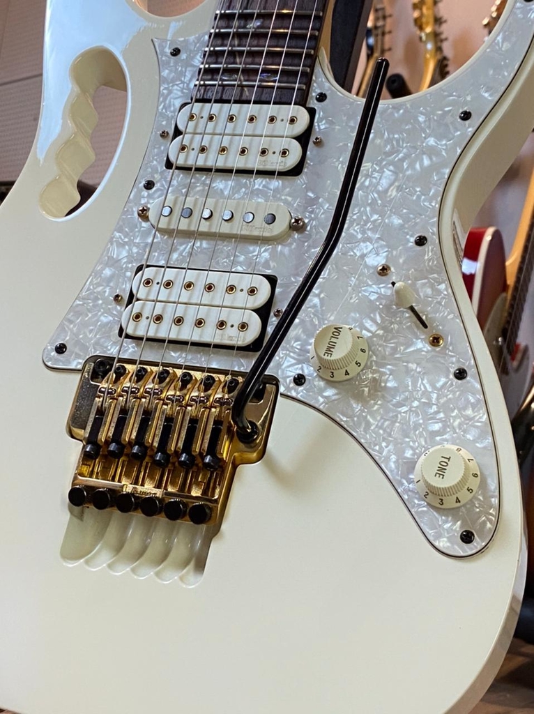 Essa é uma daquelas guitarras de tirar o fôlego, com uma beleza fora do comum e tocabilidade perfeita, acabamento impecável, uma das características que mais chamam a atenção é a abertura no corpo em formato de alça para as mãos “Monkey Grip”, a Jem 7v foi co-desenhada por Steve Vai junto à Ibanez e lançada em 1987, tornando-se uma das guitarras mais icônicas do mundo. Esse exemplar de 2006 Made In Japan “Team J. Craft” tem corpo em Alder, braço em Maple/Walnut de 5 peças, escala em Rosewood com a famosa marcação “Tree Of Life” em madrepérola, abalone e maple, tem a escala Escalopada das casas 21 até 24, trastes W/6105 com o acabamento Prestige Fret Edge, ferragem Gold, tarrachas Gotoh, ponte Ibanez Edge, escudo em Madrepérola, captação HSH sendo 1 DiMarzio Evolution Humbucker (passive/cermaic) no braço, 1 DiMarzio Evolution Single Coil (passive/alnico no meio e 1 DiMarzio Evolution Humbucker (passive/cermaic) na ponte, chave 5 posições e controles de 1 Volume e 1 Tone. Essa guitarra é um sonho de consumo, está 100% original, sem marcas ou batidas, em perfeito estado, acompanha case Original Ibanez Prestige, Chaves e Alavanca.