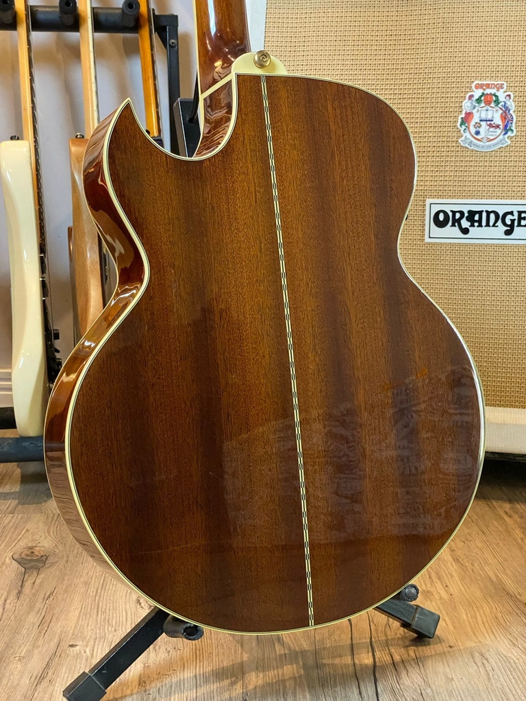 O violão Epiphone PR5E tem o visual, o som e os recursos eletrônicos para as necessidades de todas as suas gigs. Por quase 20 anos, o PR5-E conquistou os palcos com inúmeros músicos de vários estilos musicais. Desenvolvido pela Epiphone em 1990, sua forma distinta foi padronizada depois dos lançamentos de guitarras Epiphone semi-acústicas, como a Sheraton e a Casino. Mas ao invés de possuir um Double-Cutaway, possui um Cutaway “Florentine” único e singular, o resultado é um Bout mais largo e mais baixo, proporcionando graves excelentes e médios sólidos com fácil acesso aos últimos trastes no braço. O tampo Premium Select Spruce usa o método “Hand-Scalloped”, priorizando o padrão X-Bracing, o PR5-E proporciona um timbre suave excelente até quando desplugado! Seu braço em mogno com perfil SlimTaper faz dele um instrumento muito fácil e confortável de se tocar. Recentemente atualizado com seu novo PreAmp eSonic e sistema de captação NanoFlex, ele vem à vida quando plugado. Feito em cooperação com a empresa Shadow Germany. Os controles encontrados neste PreAmp incluem Master Volume, Bass, Treble, EQ Shape, indicador de bateria fraca e um Phase Switch que ajuda a eliminar feedbacks indesejados, além também de afinador. Sob o rastilho do PR5-E existe o NanoFlex, o captador de baixa impedância, diferente do Piezo, esse material único, flexível e sensível apresenta eletrônicos ativos integrados e capta não apenas a vibração das cordas, mas também as vibrações do tampo e do corpo, para um timbre acústico, sem a aspereza dos Piezos. Pra quem procura um ótimo instrumento e com custo acessível, “novo na caixa”com todas as tags, chave de ajuste e manual.